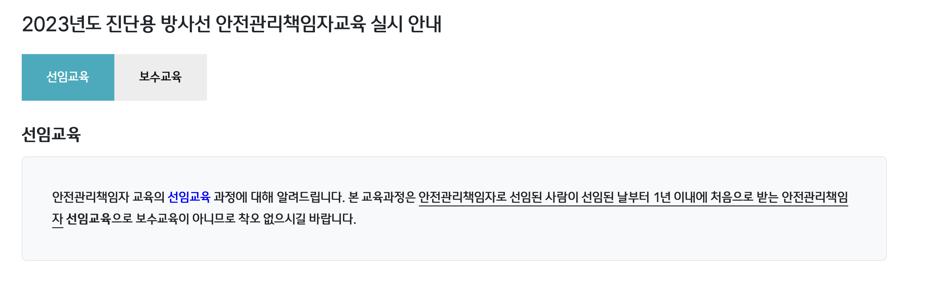 본 교육과정은 안전관리책임자로 선임된 사람이 선임교육 이수 후 2년 주기로 받는 보수교육임을 알려드립니다. 선임교육과 착오없으시기 바랍니다.